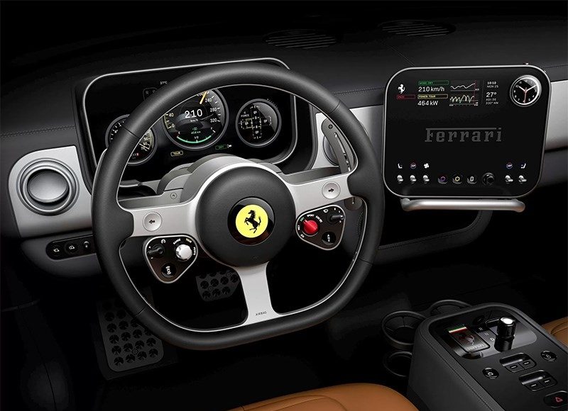 На передней панели установлен небольшой экран мультимедийной системы, который способен поворачиваться по горизонтали в сторону пассажира или водителя. Сразу под ним расположился ряд физических переключателей климат-контроля. Приборная панель выполнена в виде трех цифровых циферблатов. В свою очередь, рулевое колесо с тонким ободом и открытыми металлическими спицами отсылает к классическим моделям Ferrari пятидесятых и шестидесятых годов.
